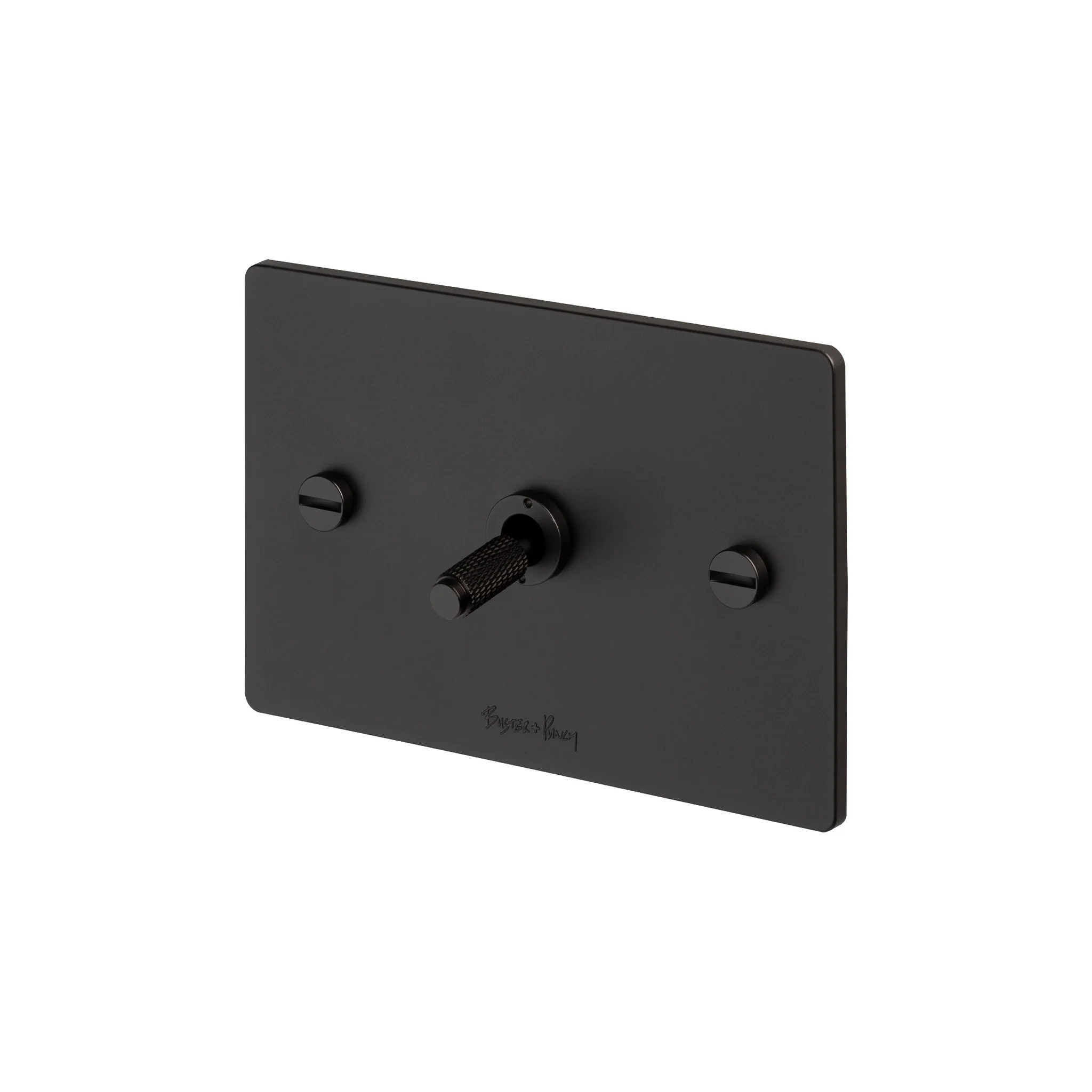 A 1G toggle switch finished in black with a solid metal black flat plate.