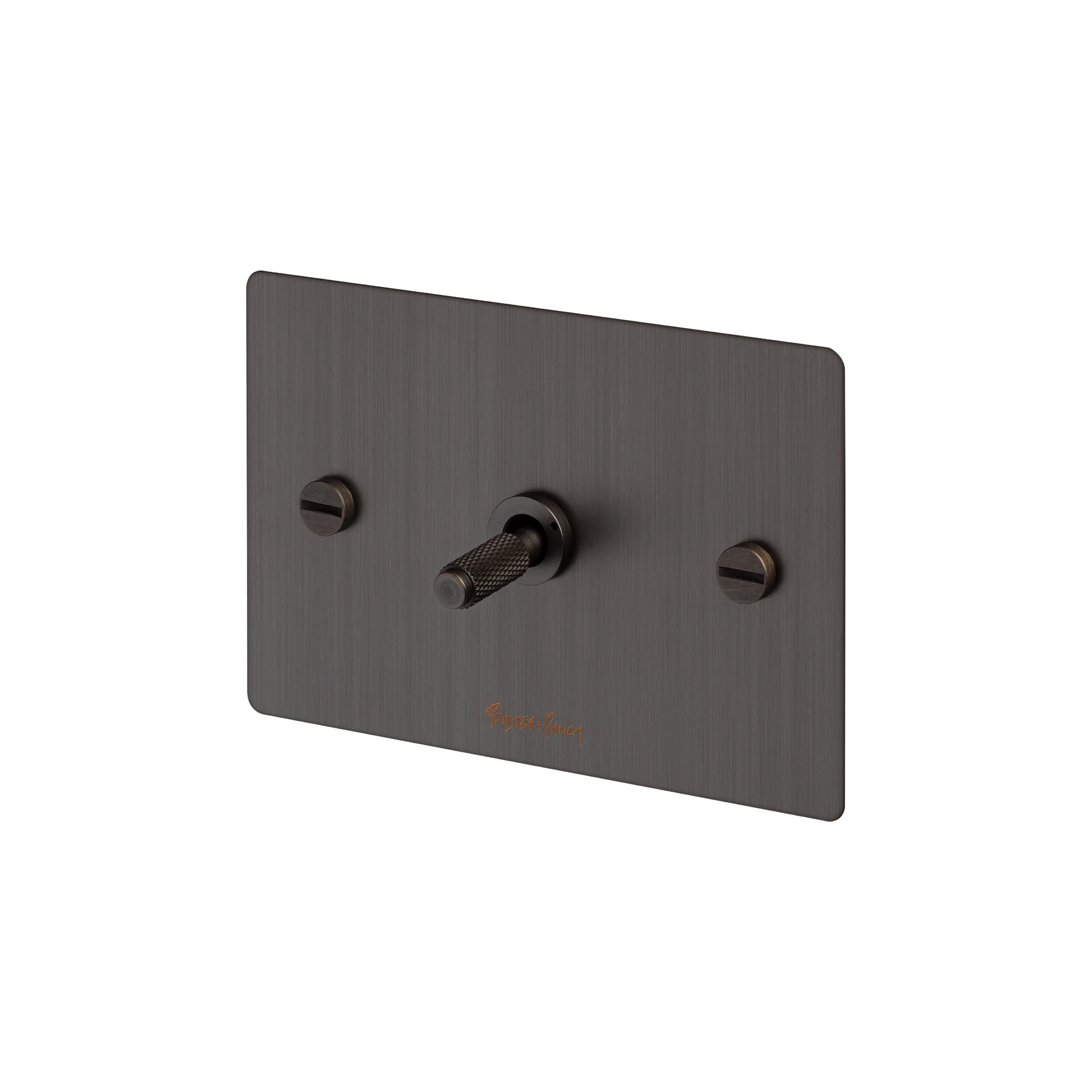 A 1G toggle switch finished in smoked bronze with a brushed smoked bronze flat plate.