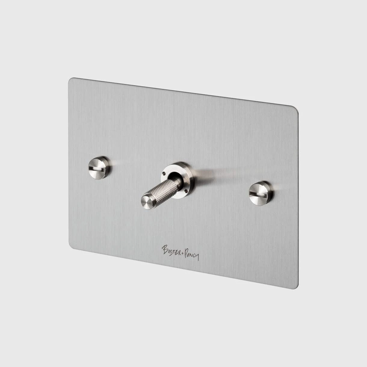 A 1G toggle switch finished in steel with a brushed steel flat plate.