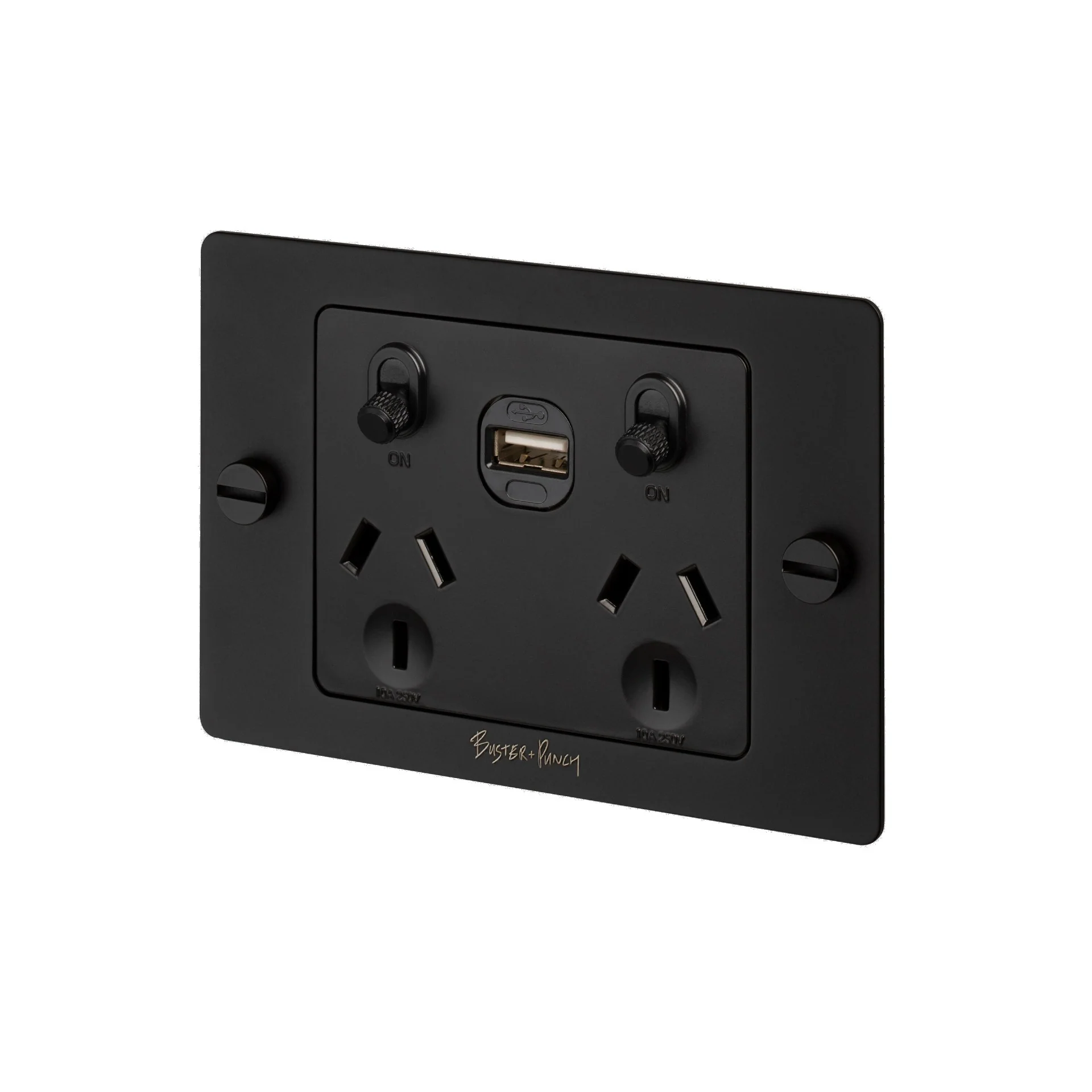 The toggle switch is made from solid metal and features the Buster + Punch signature, diamond-cut, cross knurl pattern. The gpo features a solid metal black flat plate, fixed with black penny buttons, another signature detail of Buster + Punch products.