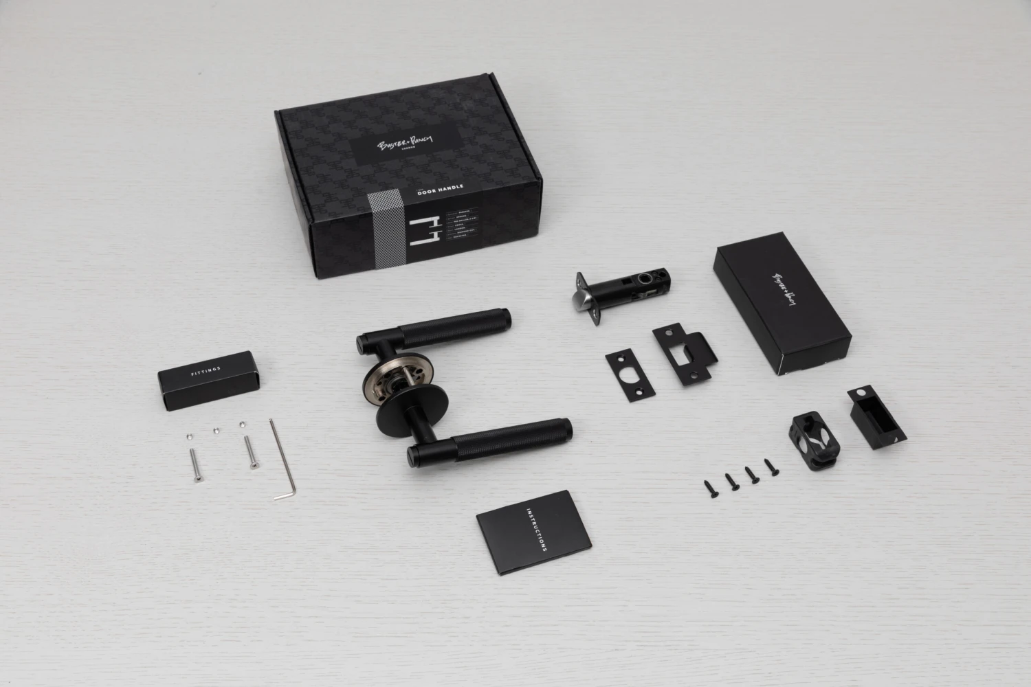 A pair of solid metal passage door handles, with an 8 mm thick sprung rose. Designed for use with Buster + Punch (centre distance 41.5 mm) specific latches. Compatible with either tubular latches or mortice locks.