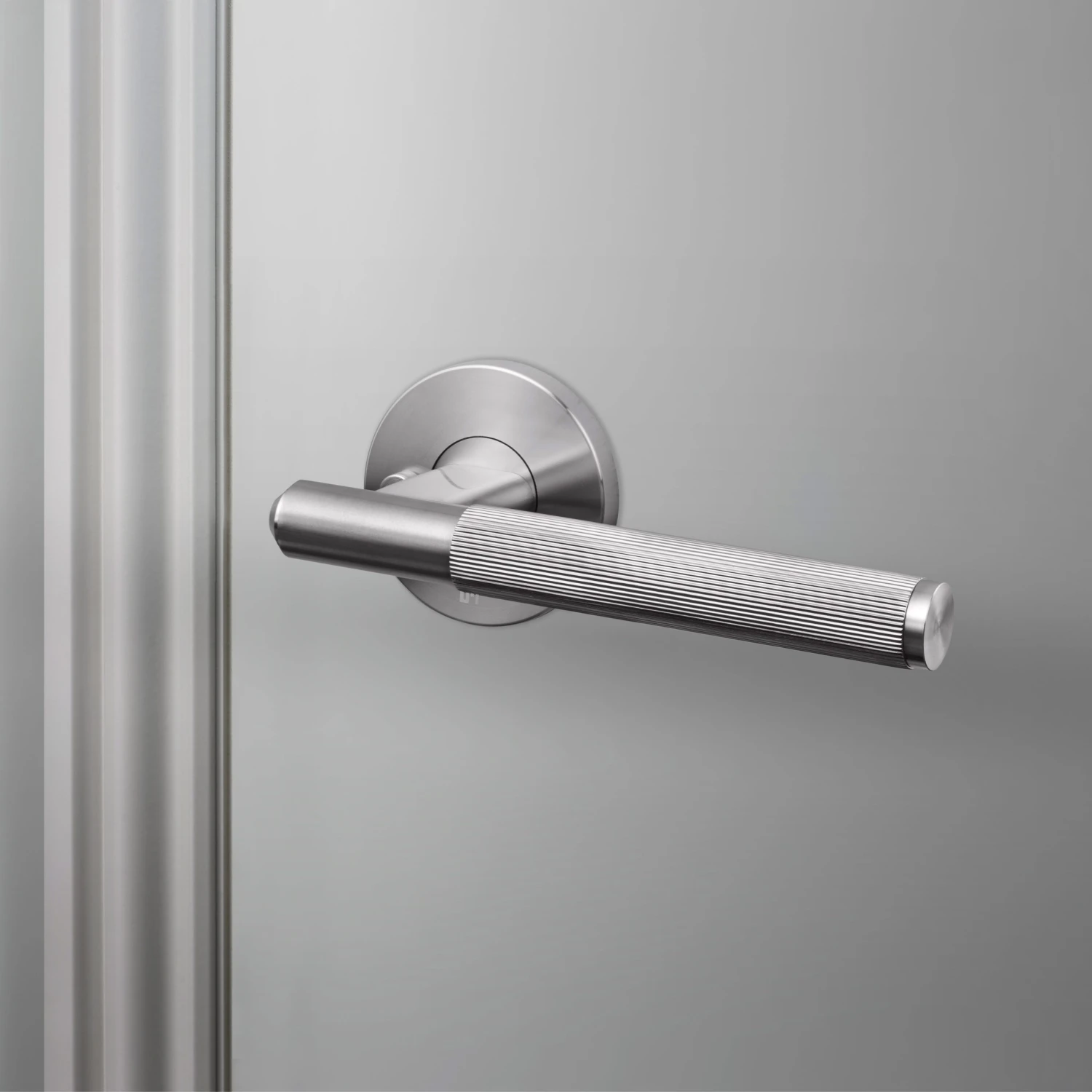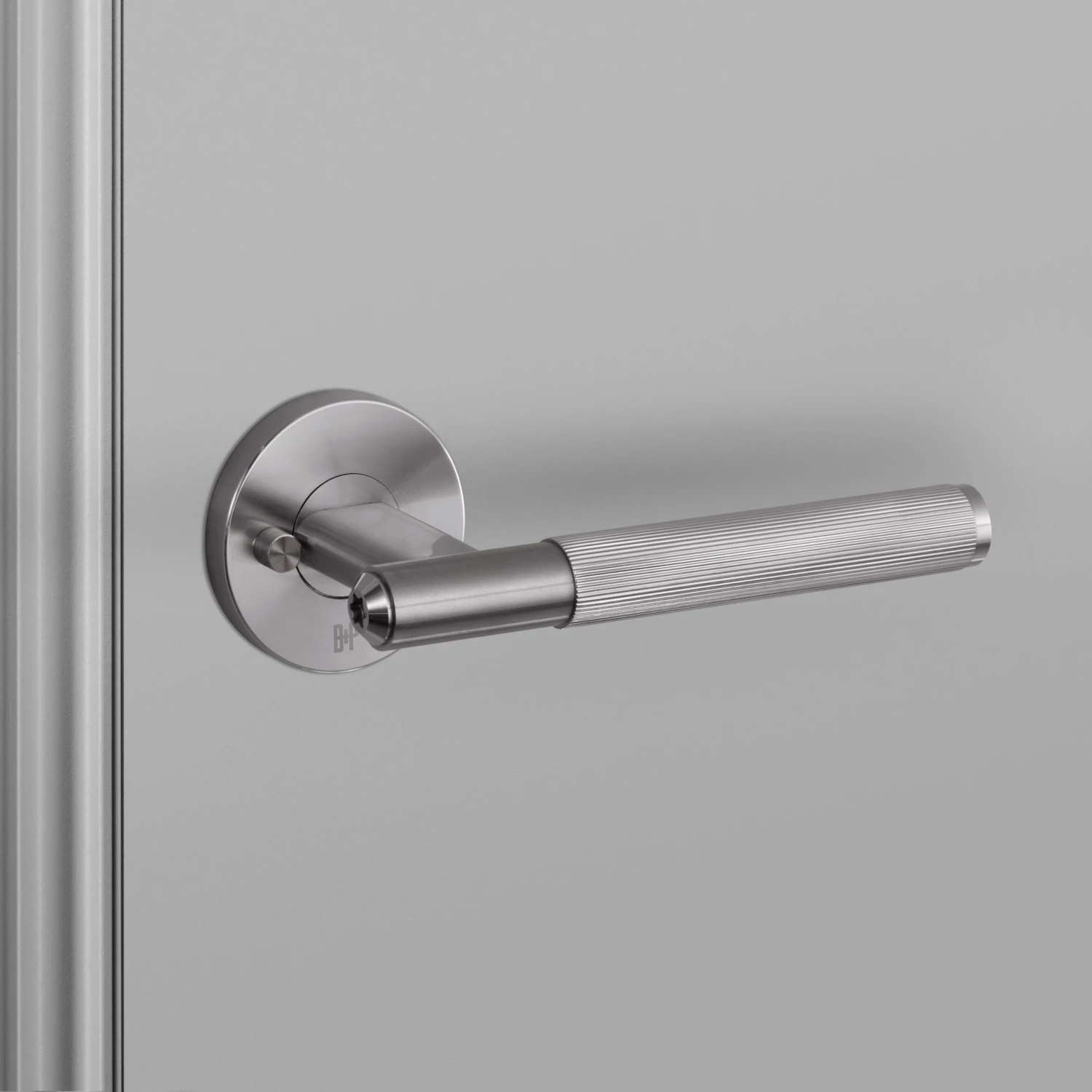 A pair of solid metal privacy door handles, with an 8 mm thick sprung rose. Designed for use with Buster + Punch (centre distance 41.5 mm) specific latches. Compatible with either tubular latches or mortice locks.