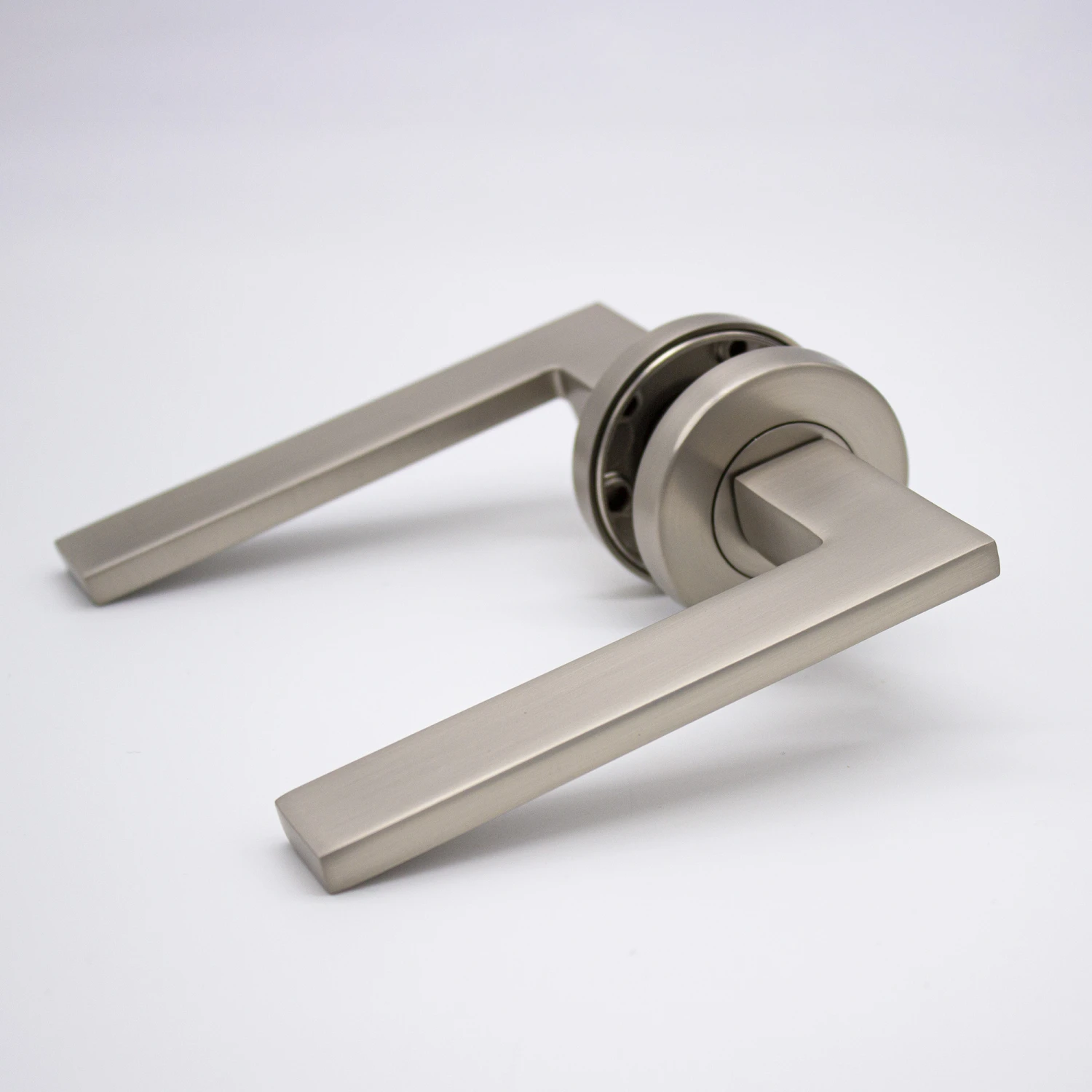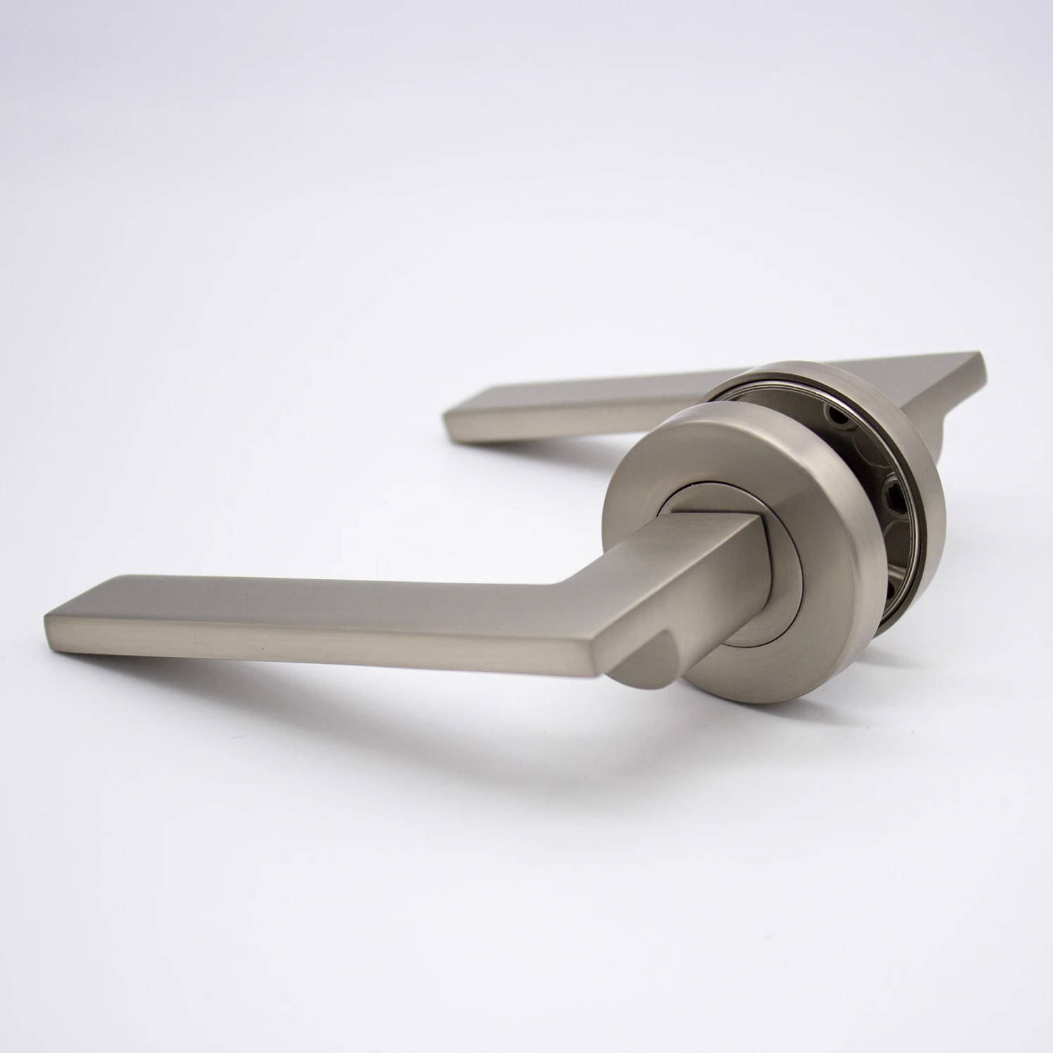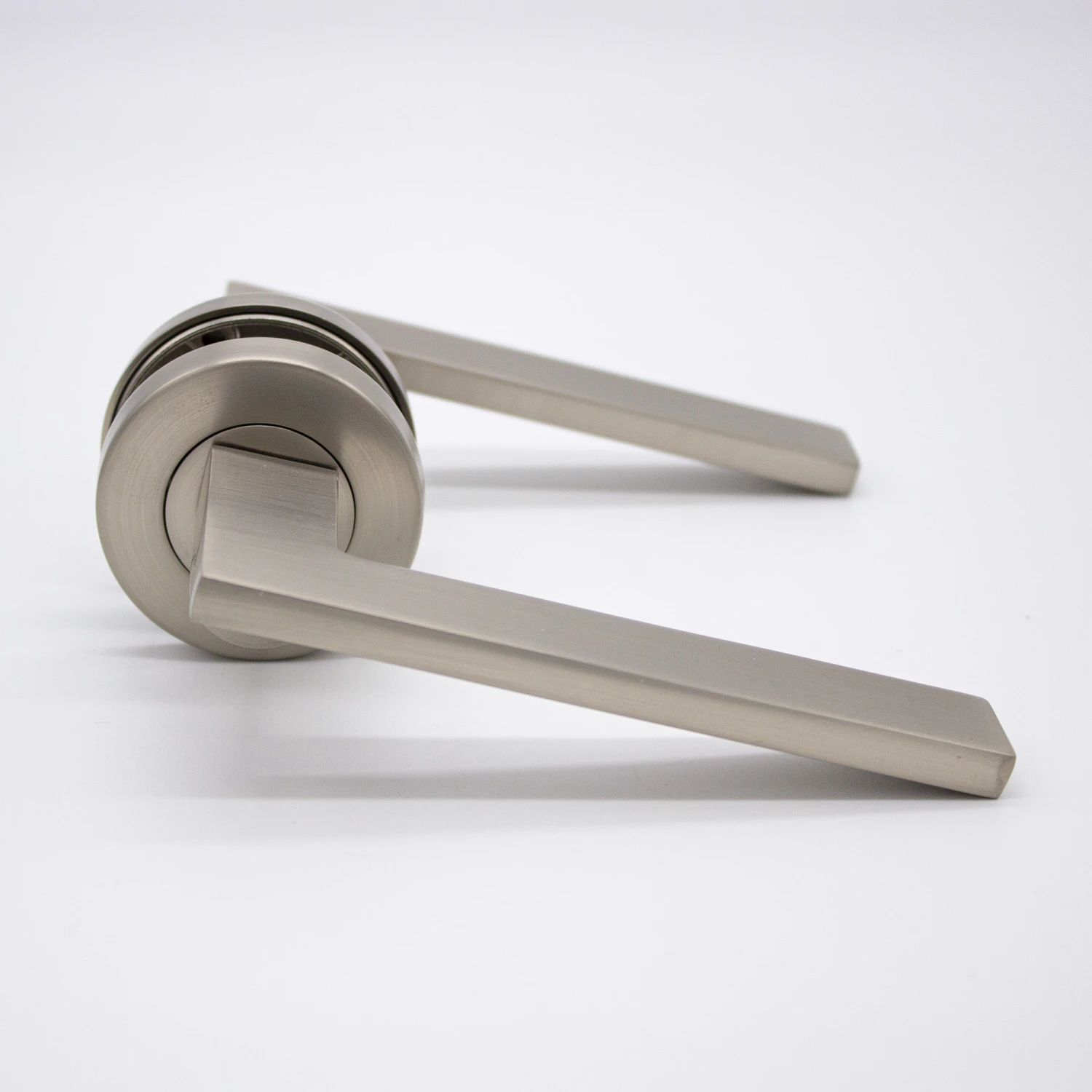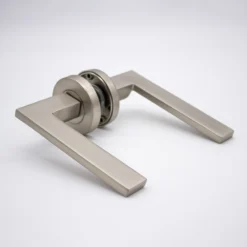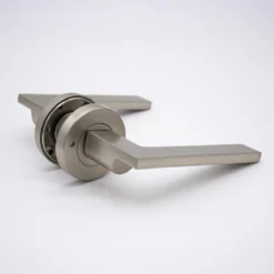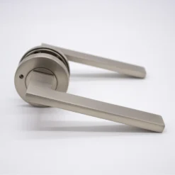 If you’re looking for modern door handles with clean lines and a sleek design, the Hamilton does not disappoint. Do not let the blade-like profile fool you, the sharp outline is smooth to the touch and feels solid under the users’ hand. This Brushed Nickel lever sits discreetly when installed and serves as a tribute to the surrounding hardware.