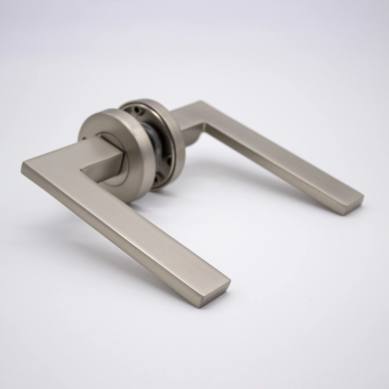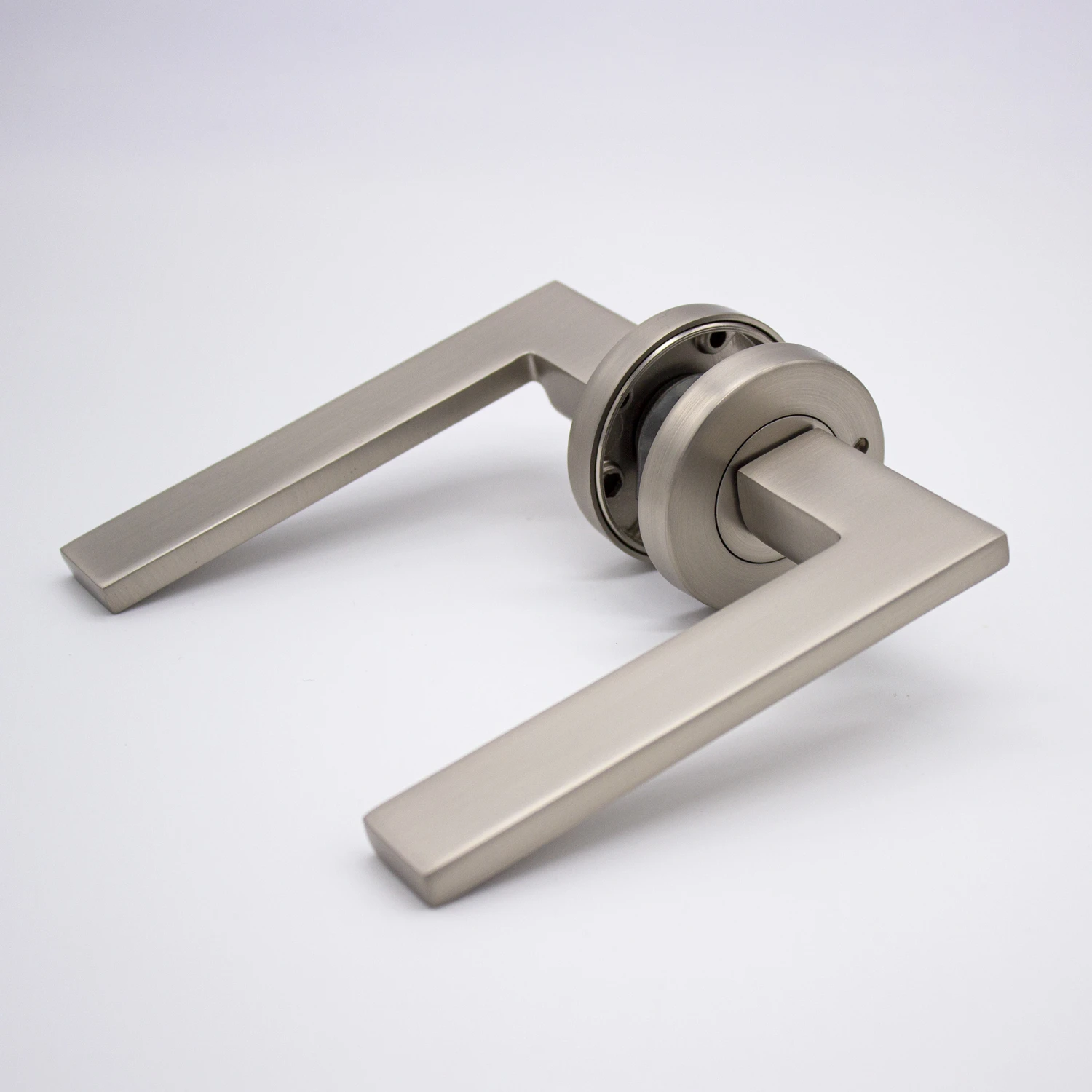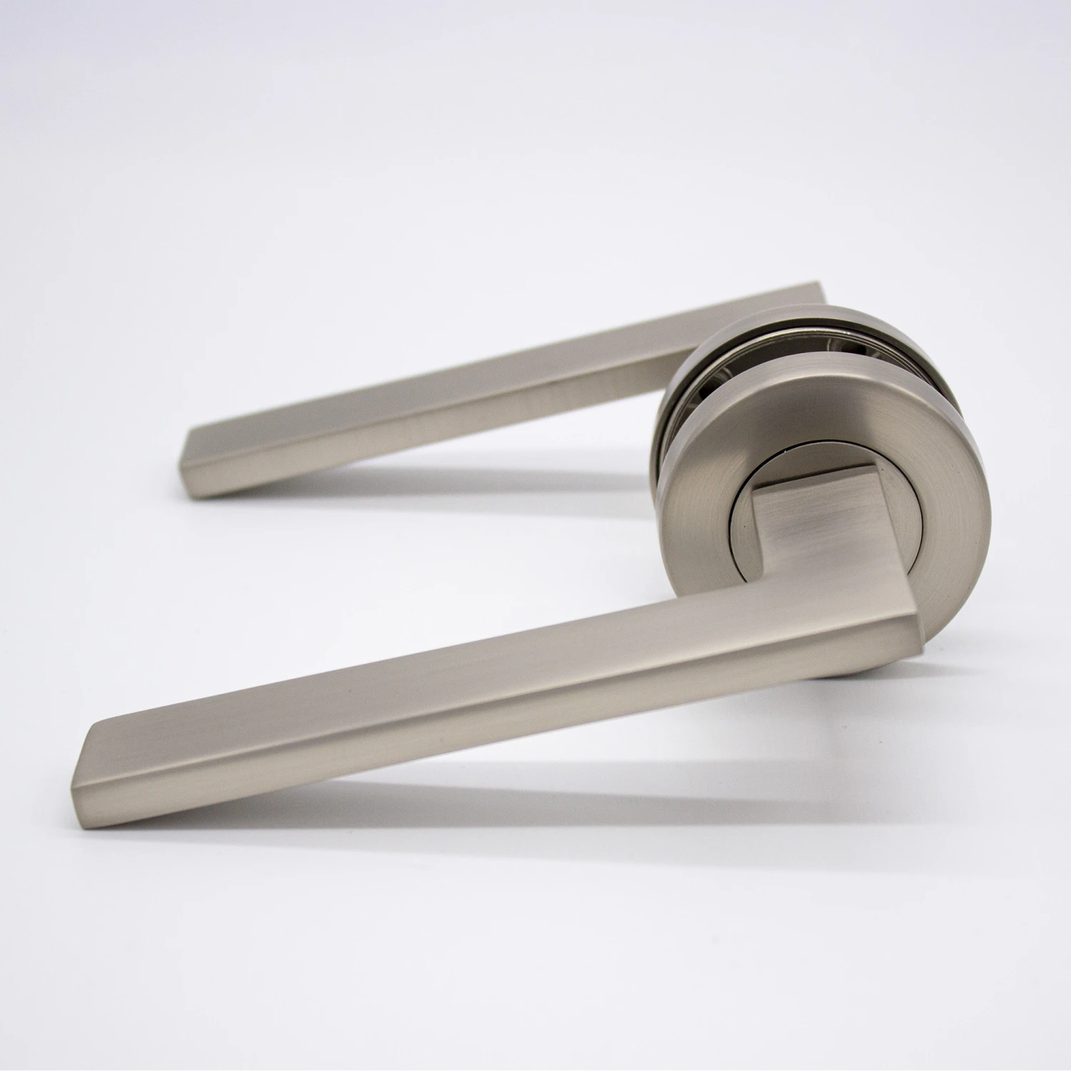 If you’re looking for modern door handles with clean lines and a sleek design, the Hamilton does not disappoint. Do not let the blade-like profile fool you, the sharp outline is smooth to the touch and feels solid under the users’ hand. This Brushed Nickel lever sits discreetly when installed and serves as a tribute to the surrounding hardware.