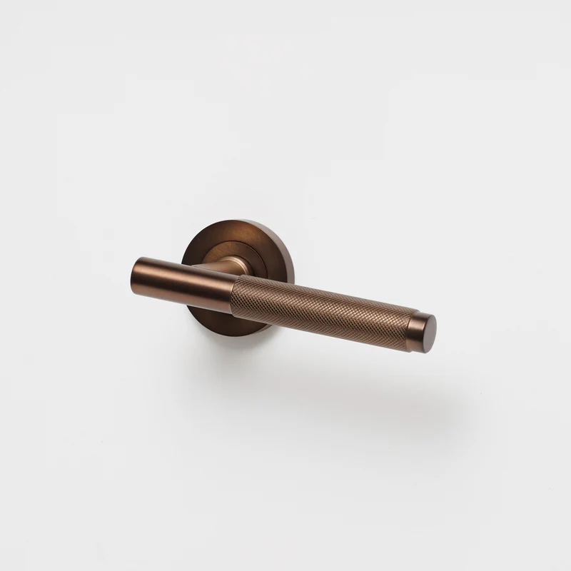 The Kintore Lever features soft diamond knurling, crafted in solid brass with an oiled bronze finish. The lever handle comes as a back-to-back set with a matching finish striker plate and is designed to be fitted to internal doors.
