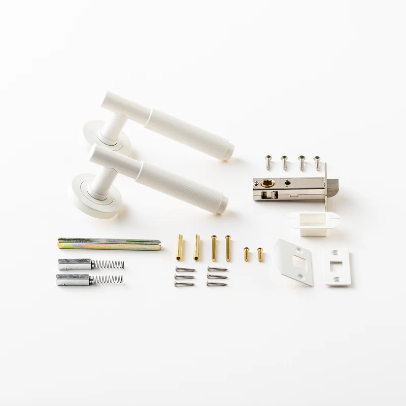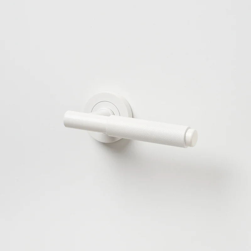 The Kintore Lever features soft diamond knurling, crafted in solid brass with a powder-coated white finish. The lever handle comes as a back-to-back set with with a matching finish striker plate and is designed to be fitted to internal doors.