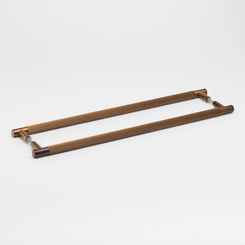 Make an impact on entry! The Lo & Co classic Linear Pull design upscaled in size and dimension as a back to back Entry Pull. Measuring 520mm in length with a 17mm diameter handle, signature linear knurling detail and smooth satin ends. Solid brass with an oiled bronze finish.