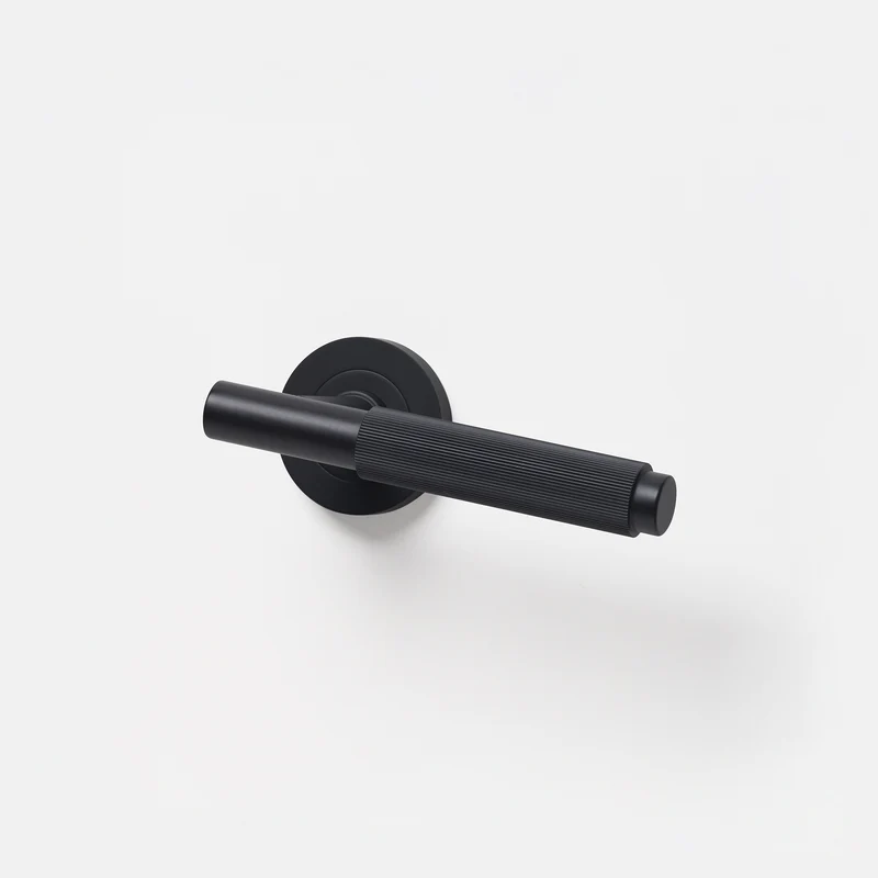 The Linear Lever handle features stunning linear knurling detail, crafted in solid brass with an electroplated matte black finish. The lever handle comes as a back-to-back set with a matching finish striker plate and is designed to be fitted to internal doors.