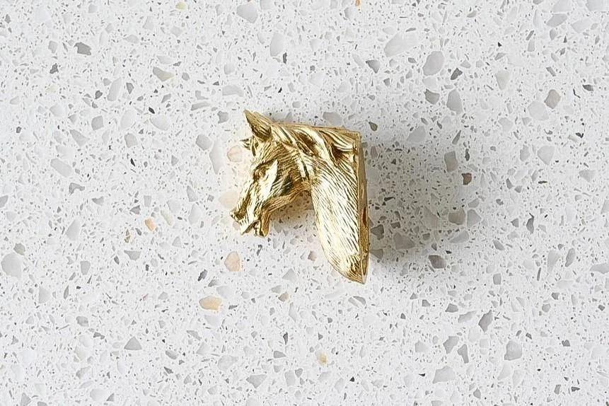 This is a beautifully cast brass cabinetry hook with a horse bust knob. This gorgeous, antique-style hardware has been hand-poured from solid brass for colour and texture matching. It’s perfect for horse lovers and children and will make a statement wherever it is used.