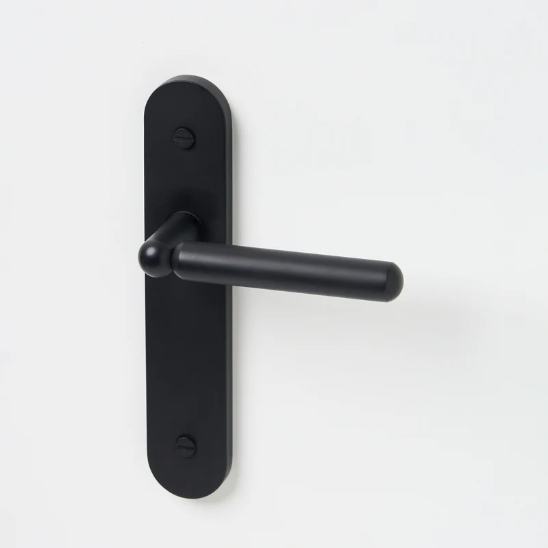 A unique cylindrical design lever pull, with an elongated oval backplate and contoured ends. Crafted in solid brass with an electroplated matte black finish. The lever handle comes as a back-to-back set with a matching finish striker plate and is designed to be fitted to internal doors.