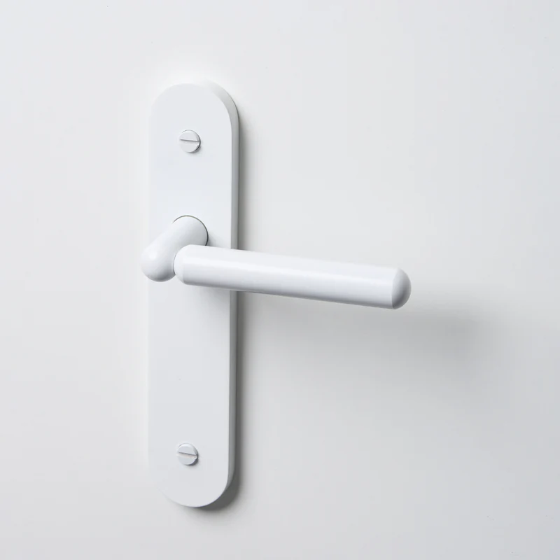 A unique cylindrical design lever pull, with an elongated oval backplate and contoured ends. Crafted in solid brass with a powder coated white finish. The lever handle comes as a back-to-back set with a matching finish striker plate and is designed to be fitted to internal doors.